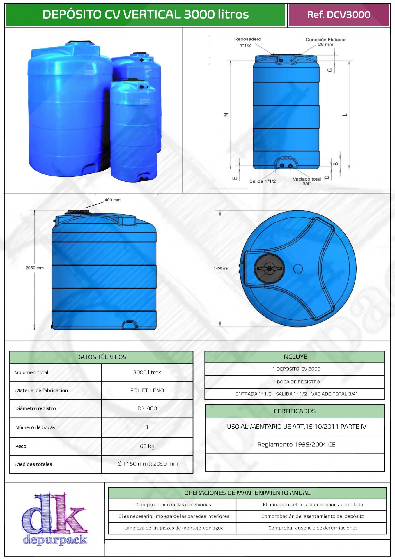 Depósito de polietileno para agua de 3000 litros de capacidad, formato vertical con fondo plano, protegido de la acción de los rayos ultravioleta para el almacenamiento de todo tipo de líquidos no agresivos, certificados para agua potable. Exclusivo para instalación en superficie.