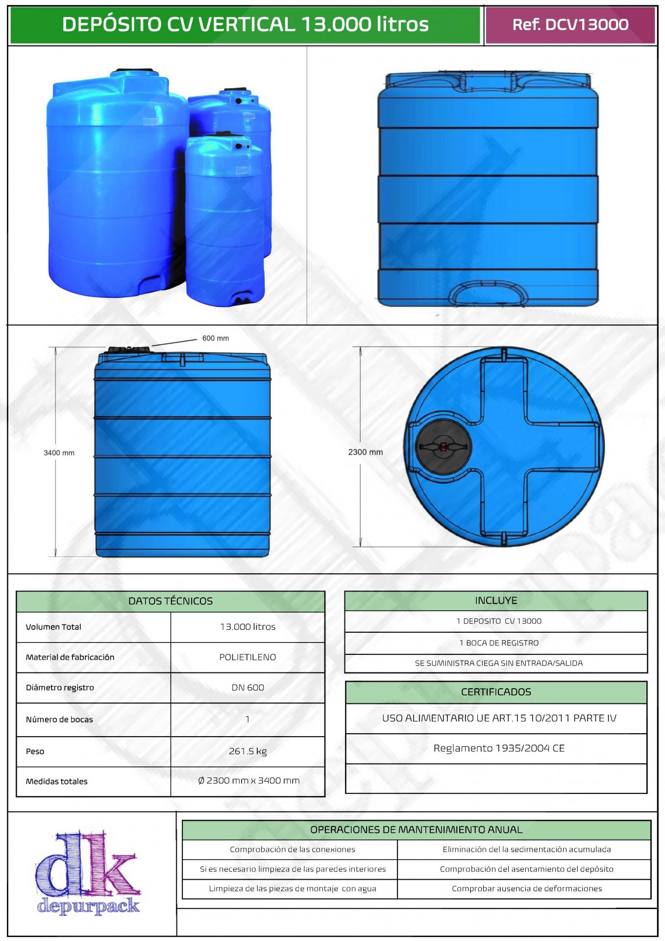Depósito de polietileno para agua de 13.000 litros de capacidad, formato vertical con fondo plano, protegido de la acción de los rayos ultravioleta para el almacenamiento de todo tipo de líquidos no agresivos, certificados para agua potable. Exclusivo para instalación en superficie.